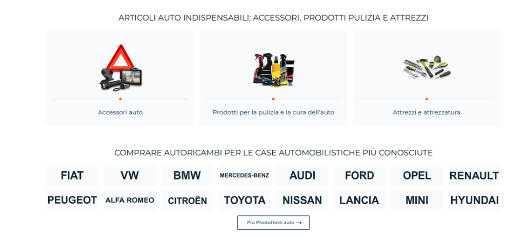 Il modo più semplice per trovare il ricambio giusto è utilizzare il sistema di ricerca per marca e modello. Basta selezionare la tua auto dal menu a tendina e il sito ti mostrerà tutti i ricambi e gli accessori compatibili con il tuo veicolo.