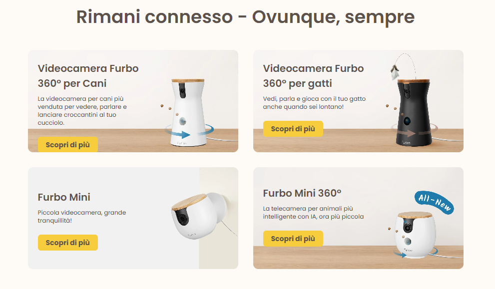 - Scegli il modello più adatto: base o con funzione 360° e lancio snack. (furbo.com)