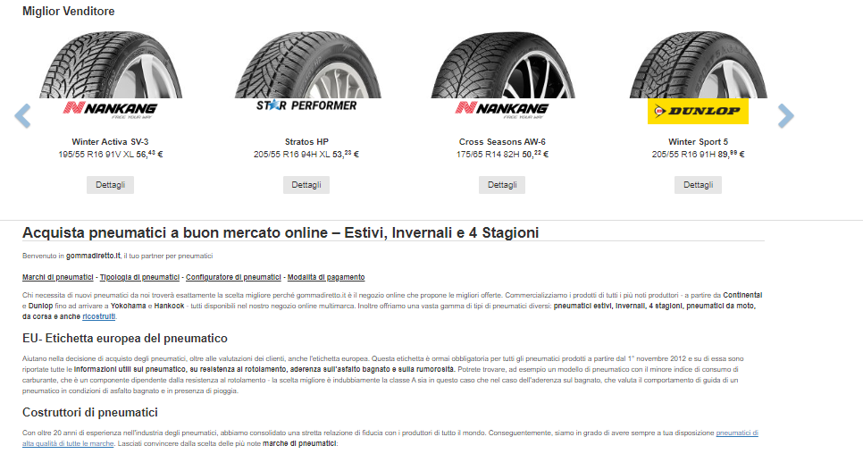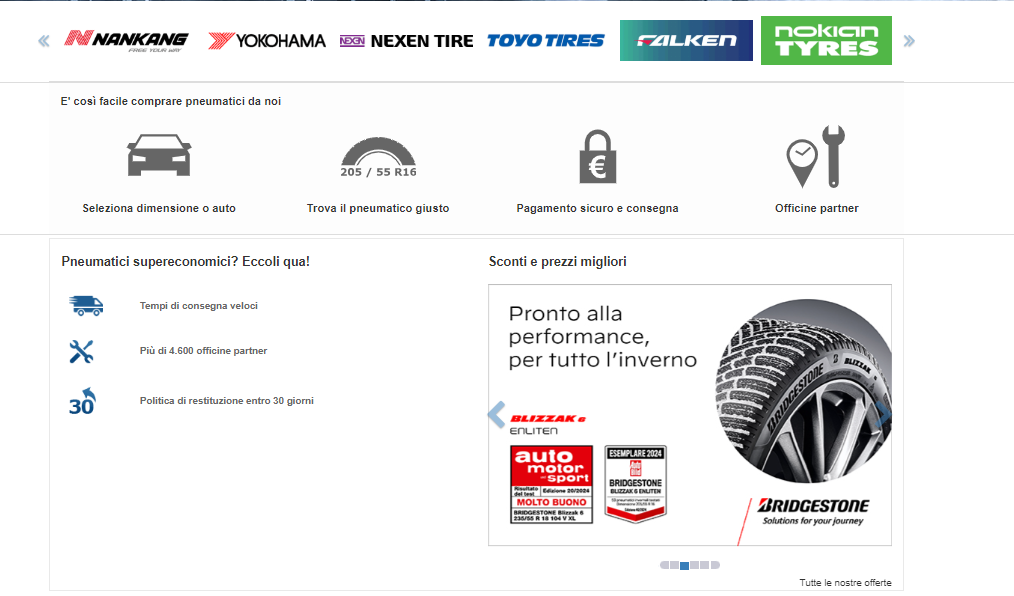 Il punto di forza di Gommadiretto è la sua varietà: ogni cliente può trovare pneumatici adatti alle proprie esigenze, con filtri per misura, indice di velocità, tipo di veicolo e stagione.