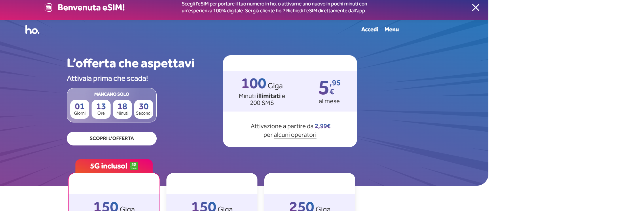 • Offerte con 150 GB, minuti illimitati e 200 SMS a 9,95 euro al mese. ho-mobile.it