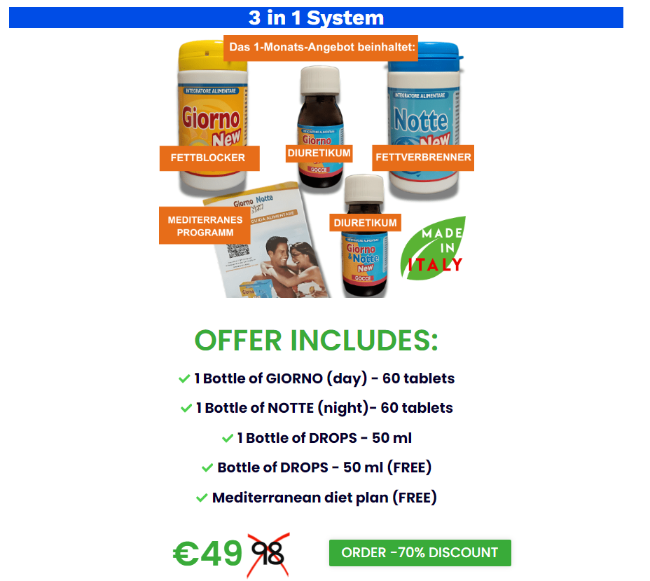 Prendersi cura del proprio corpo significa molto più che semplicemente perdere peso: è un viaggio verso l’equilibrio, la leggerezza e una sensazione di benessere che dura nel tempo. Con Giorno & Notte, questo percorso diventa finalmente semplice, naturale e strutturato secondo i ritmi del corpo. Questo programma nasce in Italia e si distingue per la sua formula intelligente che agisce in sinergia tra giorno e notte, aiutando il metabolismo a lavorare in modo costante e mirato.