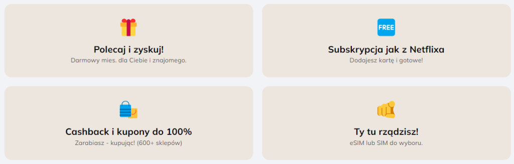 Ponadto Fonia zapewnia: darmową dostawę karty SIM (lub natychmiastową aktywację eSIM po weryfikacji online), roaming w Unii Europejskiej w określonym zakresie, oraz system cashbacku dla opłaconych subskrypcji.