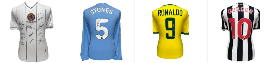 • Signed jerseys, boots, gloves, balls and photos from major players and legends—for example football shirts signed by prominent names, framed and ready for display.