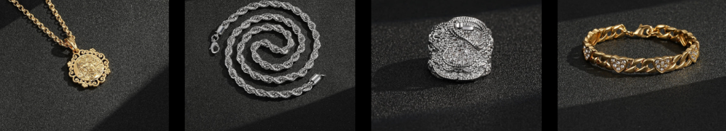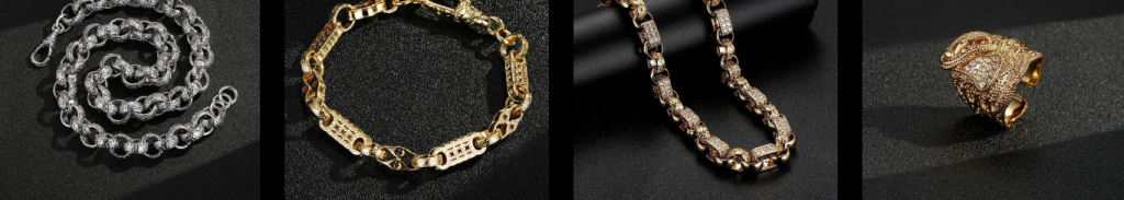 - Bracelets: Chunky Cuban bracelets, belcher bracelets, bangles, and adjustable pieces suitable for men, women, and children.