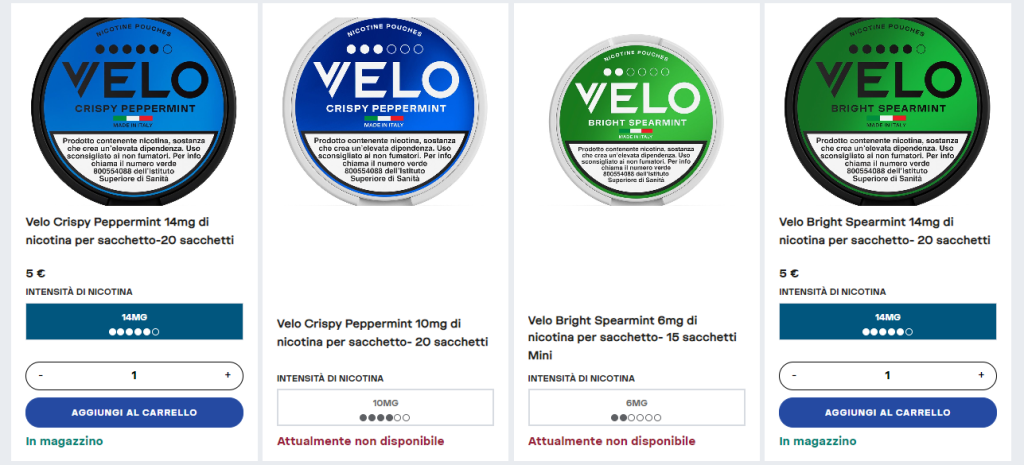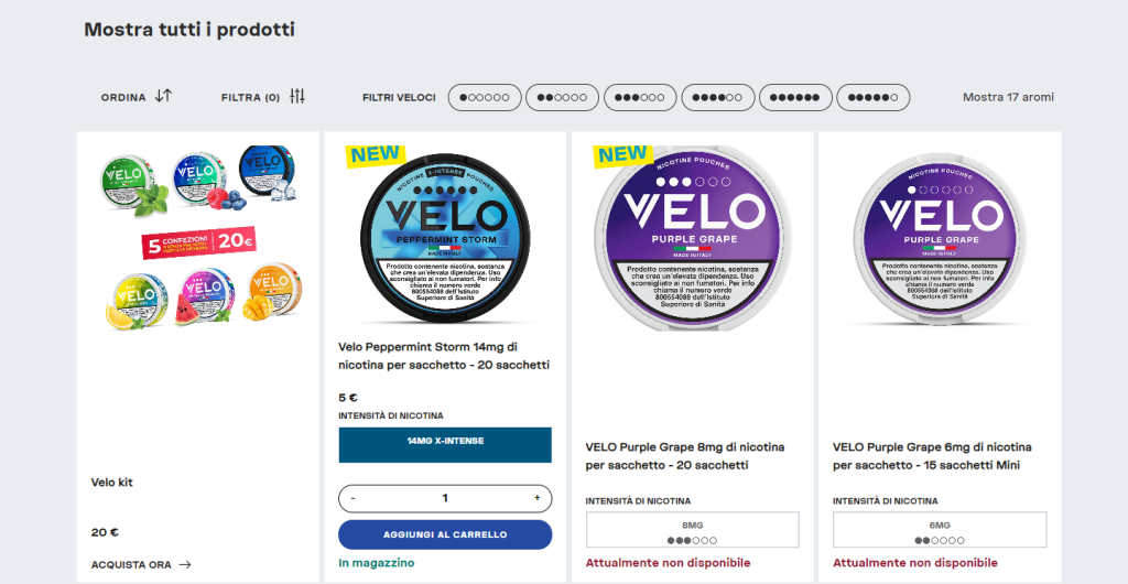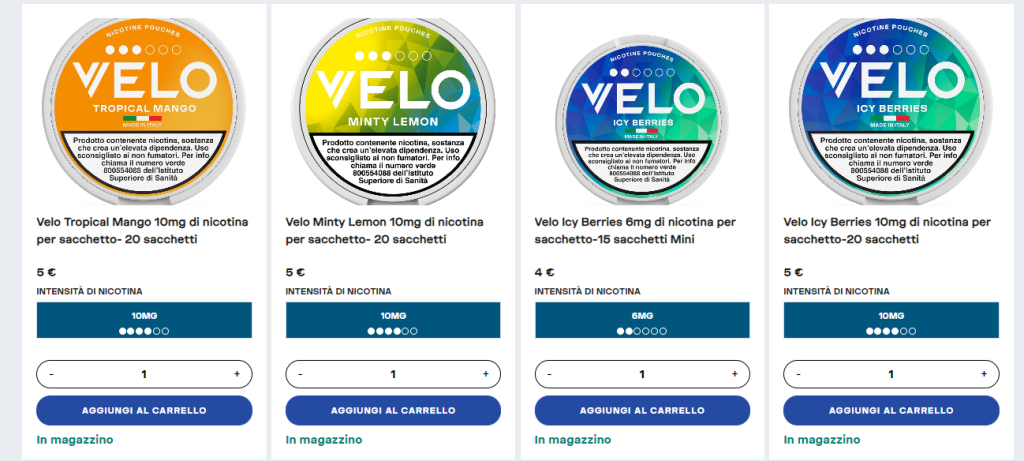 Ogni prodotto di Velo è conforme alle normative vigenti sui prodotti a base di nicotina. Etichettatura chiara, dosaggi controllati e packaging sicuro garantiscono un utilizzo responsabile. La piattaforma fornisce informazioni dettagliate sui prodotti e sulle modalità di consumo, permettendo agli utenti di fare scelte consapevoli e sicure.