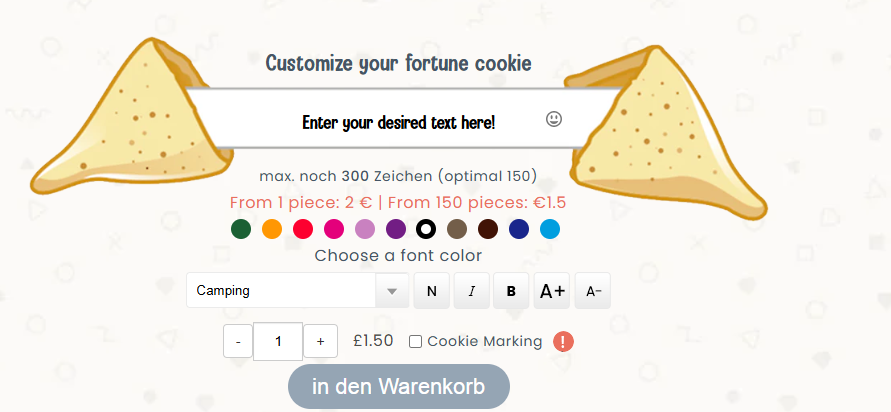 Bei Wunschkeks.de hast Du die Freiheit, Geschenke so zu gestalten, dass sie zu der Empfängerperson passen. Du kannst Humor, Liebe, Wertschätzung und Persönlichkeit in Deinen Entwurf einfließen lassen – und am Ende etwas schenken, das kein zweites Mal existiert.