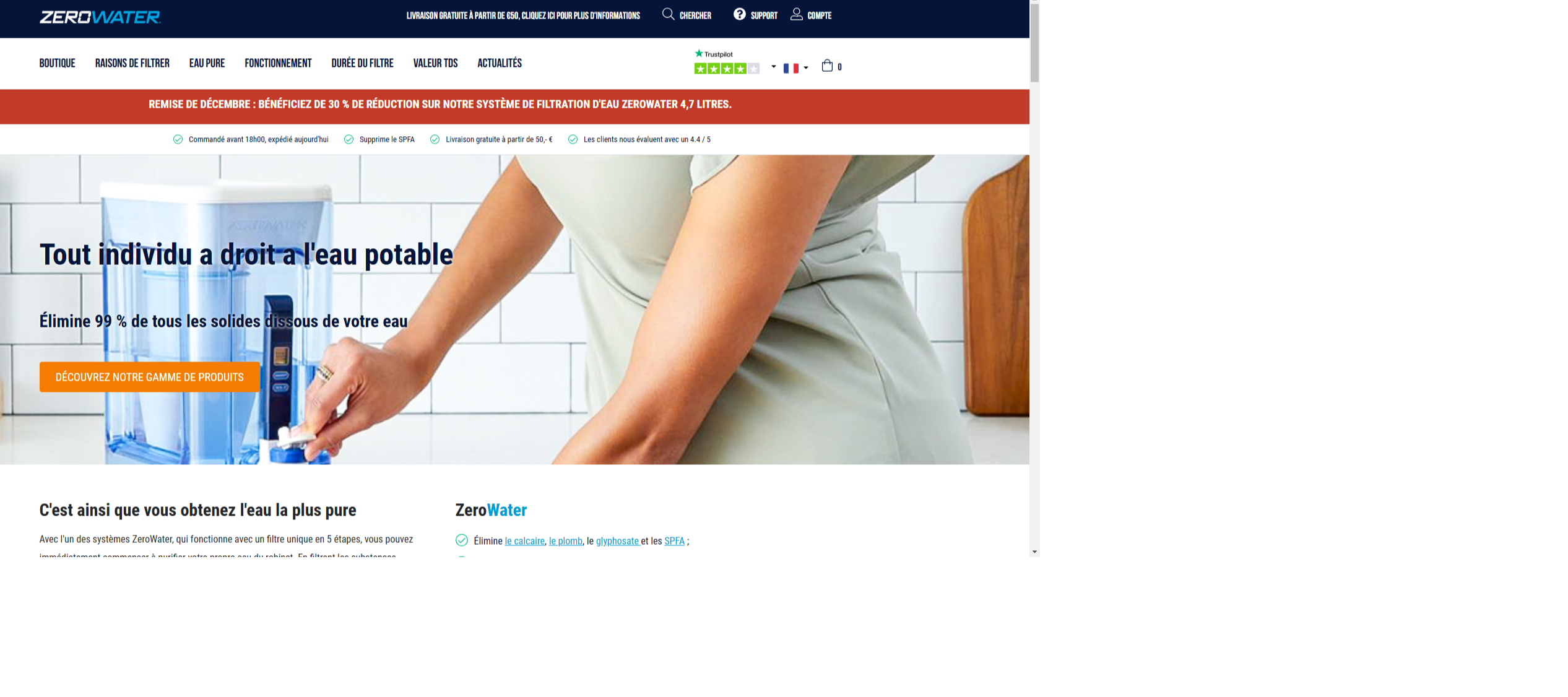L’eau du robinet fait partie du quotidien. Elle coule librement, fraîche et accessible, mais sa qualité peut varier selon la région, l’âge des installations et la présence de contaminants invisibles. ZeroWater apporte une réponse moderne et efficace en proposant des solutions de filtration supérieures qui permettent d’obtenir une eau plus propre, plus saine et meilleure au goût. Avec une technologie de filtration avancée, ZeroWater devient vite un choix évident pour toute personne soucieuse de la qualité de son eau potable.