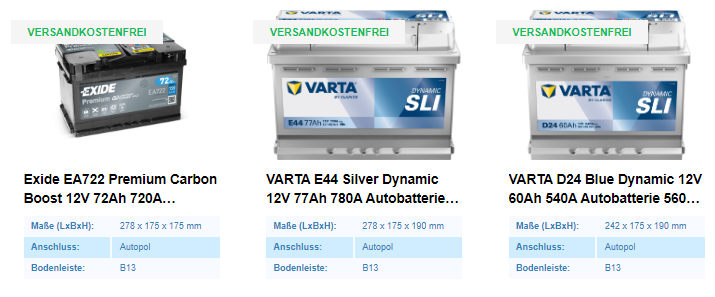 - AGM‑ und EFB‑Batterien, die besonders robust und wartungsarm sind – ideal für Fahrzeuge mit Start‑Stopp‑Systemen oder häufigen Kurzstrecken.