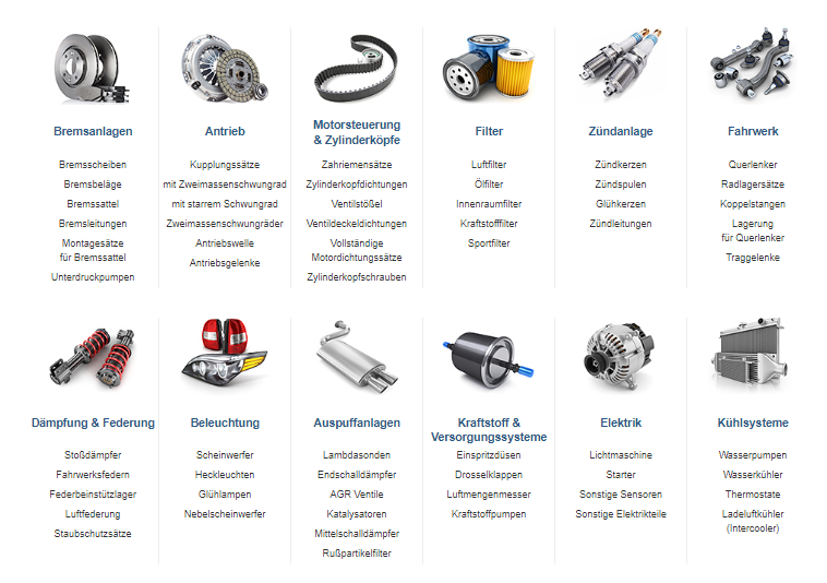 • Fahrzeugersatzteile wie Bremsen, Filter, Stoßdämpfer, Zündsysteme, Achsteile und viele weitere Komponenten, die für verschiedene Marken und Modelle verfügbar sind.