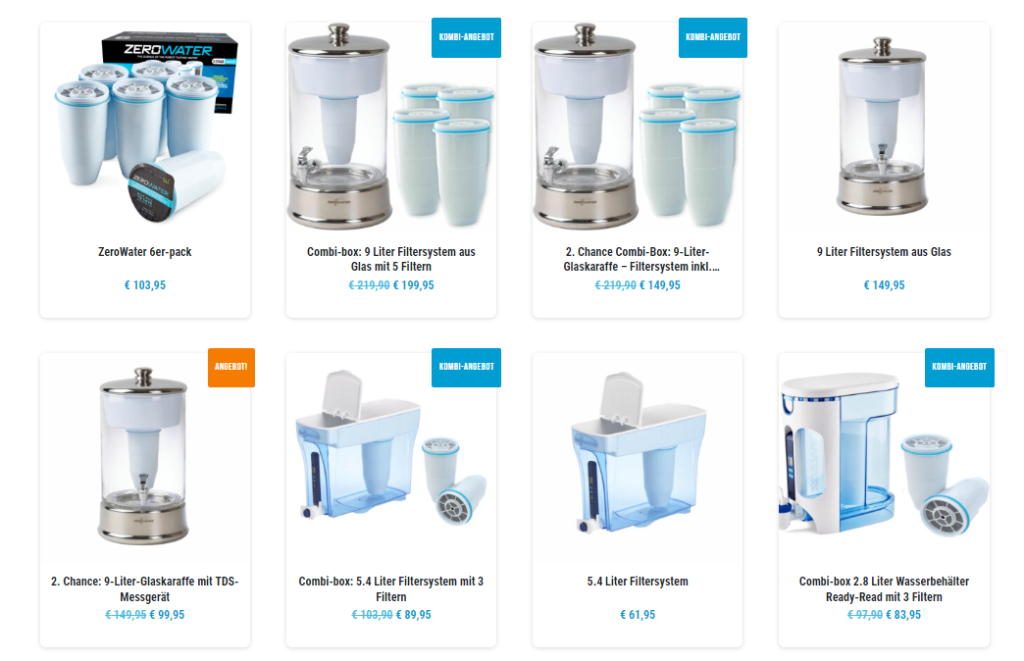 Produktvielfalt auf der Zerowater-Website