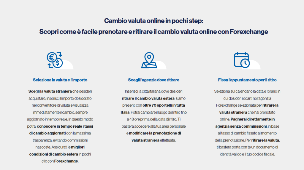 Uno degli elementi che rendono distintiva l’esperienza con Forexchange rispetto ad altri operatori di cambio è la rete fisica di oltre 70 sportelli disseminati in punti strategici del Paese, come aeroporti, stazioni ferroviarie, centri storici e outlet. Questo permette di accedere ai servizi anche senza passare per la prenotazione online, con la possibilità di affidarsi a personale esperto e qualificato per effettuare il cambio in loco, ricevere informazioni personalizzate e risolvere eventuali dubbi o esigenze specifiche.