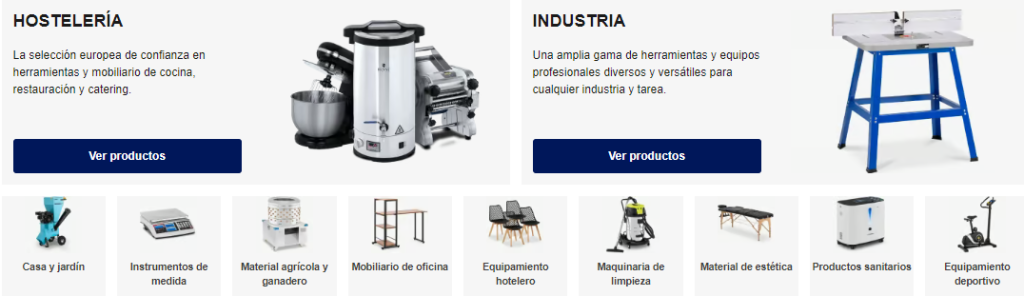 - Equipos para hostelería: maquinaria y utensilios para cocina profesional, refrigeración y servicios alimentarios.