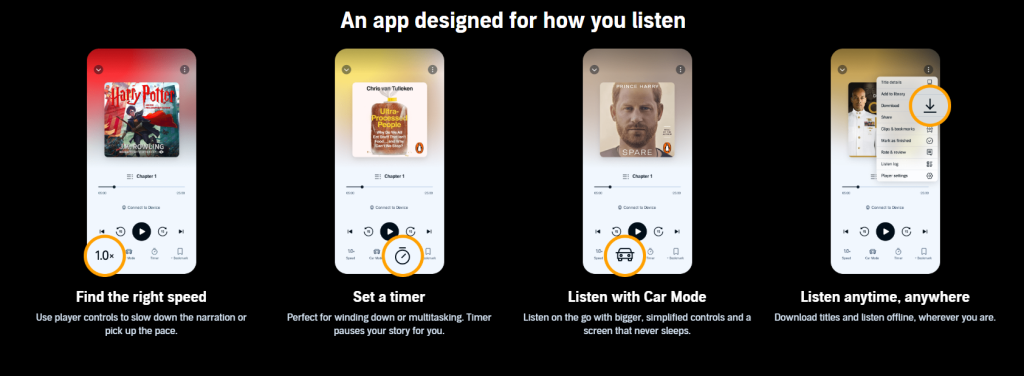 Audible se distingue par la facilité d’utilisation de sa plateforme. Les utilisateurs peuvent naviguer facilement parmi les catégories, rechercher des titres spécifiques et gérer leur bibliothèque personnelle avec simplicité.