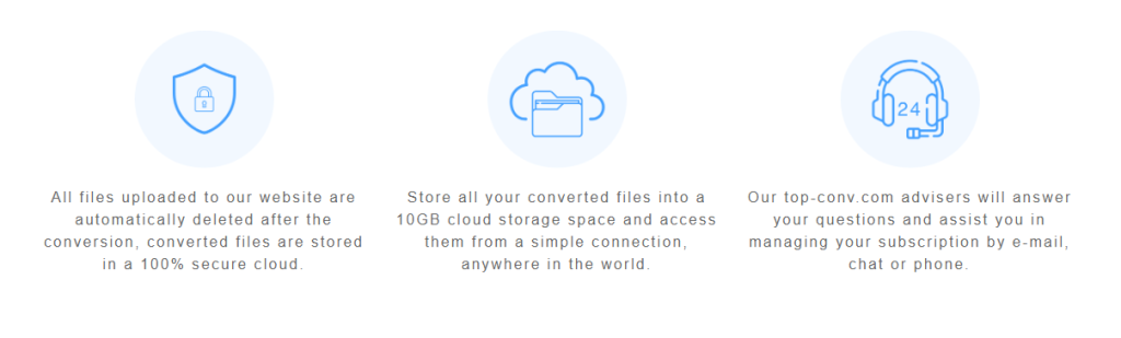 En plus de la conversion, Top-Conv propose un espace de stockage en ligne. Selon l’abonnement choisi, les utilisateurs peuvent bénéficier de plusieurs gigaoctets pour conserver leurs fichiers convertis.